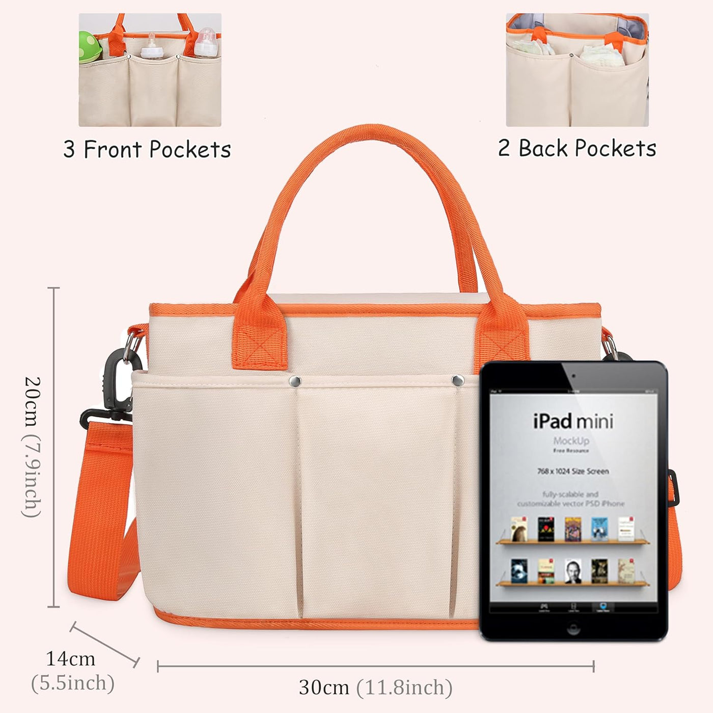 This baby changing bag comes with a short handle, an adjustable shoulder strap, and 2 stroller clips. Carry it as a shoulder bag, crossbody, or by hand. Additionally, it can be conveniently attached to your child's stroller, freeing up your hands. The stroller hook isn't exclusive to this bag, it can be used with other bags featuring small hooks.